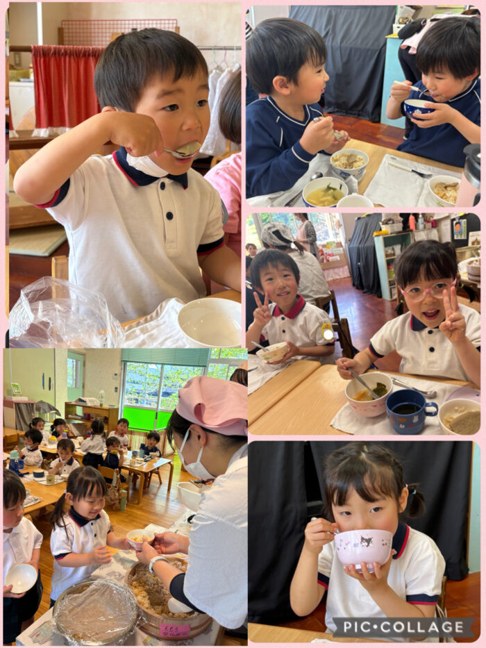 黄さんが掘って、青さん・桃さんが皮をむいて、黄さんが料理をした筍ご飯は、やっぱり絶品!