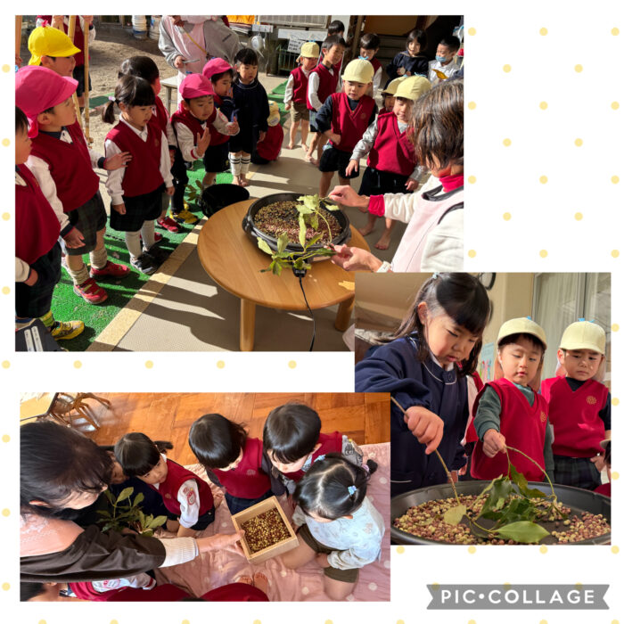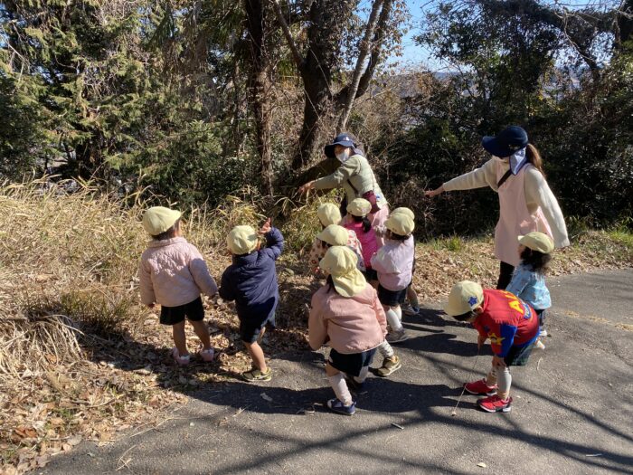 たんぽぽ組(未満児クラス)は、おやまに散歩に行って、鬼の住処“鬼の酒盛り山”に向かって、大きな声で「おには〜そと!ふくは〜うち!」自分のお腹の中にいる悪い鬼もしっかり(?)退治しました。