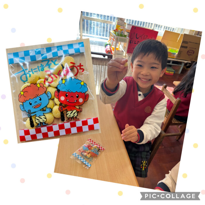 お腹の中の鬼も風邪バイキンもやっつけちゃうぞ!と、子どもたちも一緒に元気いっぱい「鬼は〜外〜!福は〜うち〜!」と鬼退治をしました!