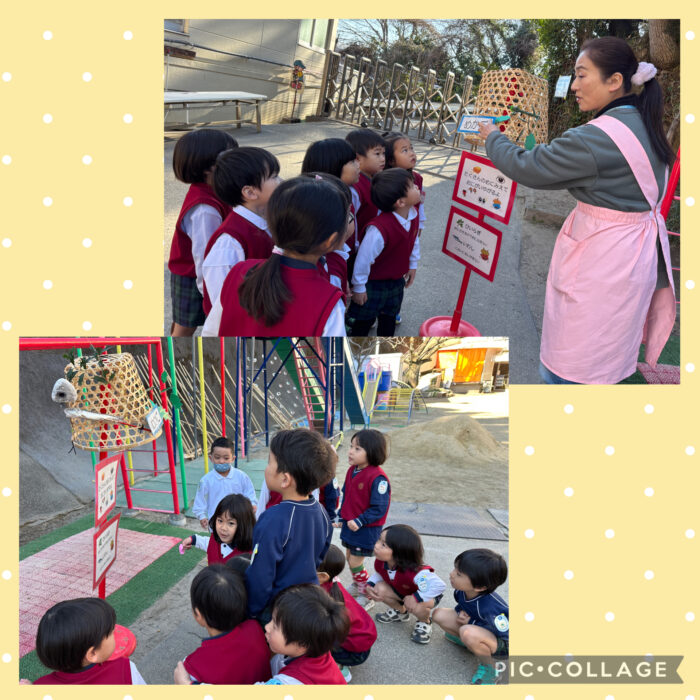 幼稚園の門には、鬼の嫌いなトゲトゲの“ヒイラギ”に、臭い匂いの魚の“イワシ”、目がたくさんあるように見える“めかご”を飾りました。