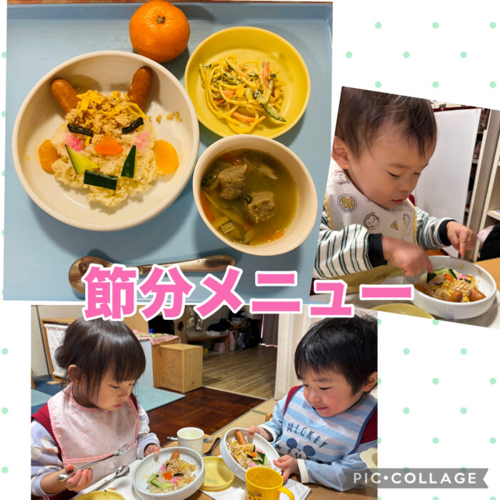 今日の給食メニューは、彩りきれいな【鬼っこご飯】と、鰯のつみれ団子が入った【鬼退治団子汁】子どもたちは、「ツノは、ウインナーだ!」「これは、きゅうり!」「ピンクの何?(桜でんぶ)」とウキウキしながら、嬉しそうにニコニコ食べる子どもたちでした。