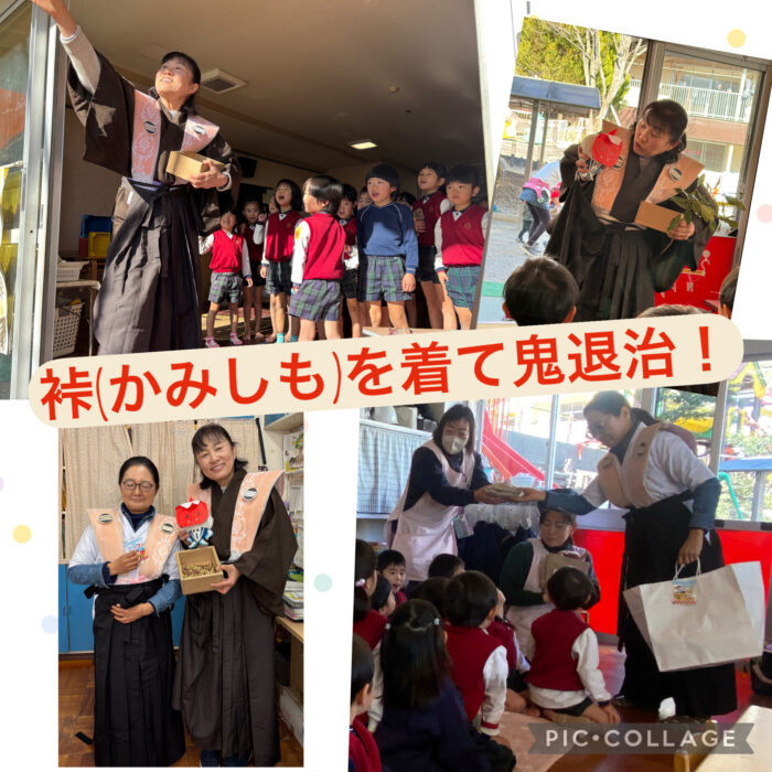 お豆の用意ができると、ちえ園長先生とゆりこ先生が“裃(かみしも)”を着て、みんなを代表して豆まきをしました。
