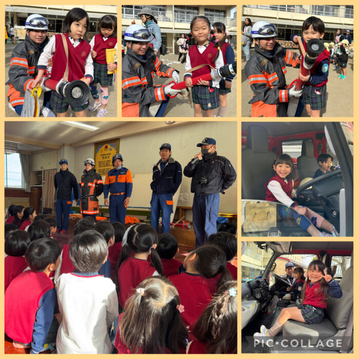 また、消防団さんが乗ってきてくれた消防車を間近で見て説明してもらったり、ホースを持たせてもらったり、運転席に乗せてもらったり…♪