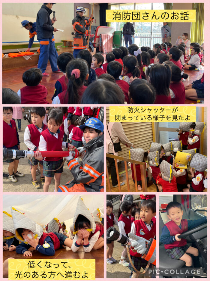 消防団さんからお話しの後は、園内の防火扉や防火シャッターが閉まっているところを見たり、シーツを煙に見立てた煙体験をしたり、消化器を使っての消化練習を見たりしました。