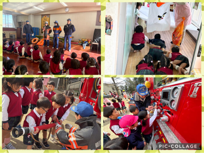 消防団の方から、服装や道具の説明、号令の掛け方などを見せてもらい、年長組の黄組は真似して一緒に体験もしました。